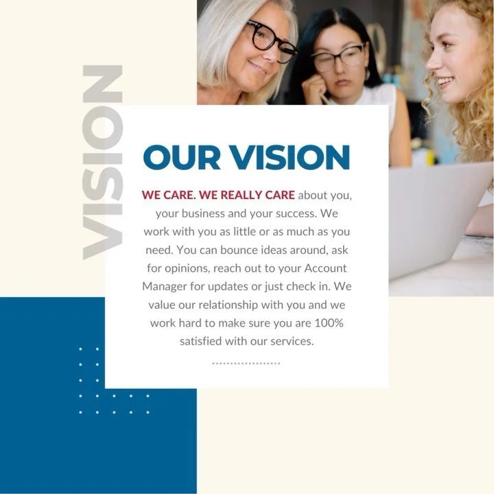 WE CARE. WE REALLY CARE about you, your business and your success. We work with you as little or as much as you need. You can bounce ideas around, ask for opinions, reach out to your Account Manager for updates or just check in. We value our relationship with you and we work hard to make sure you are 100% satisfied with our services.